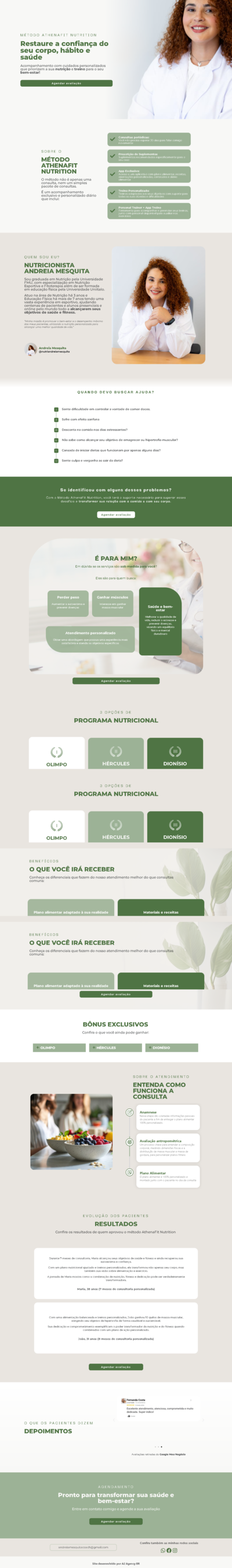 Para a Nutricionista Andreia Mesquita, a missão era criar um site moderno e funcional, destacando seu trabalho e apresentando o Método Athena Fit, uma abordagem inovadora focada em saúde e bem-estar. Trabalhamos com uma paleta de tons verdes, trazendo frescor e leveza ao design — perfeito para transmitir vitalidade e conexão com a área da nutrição.