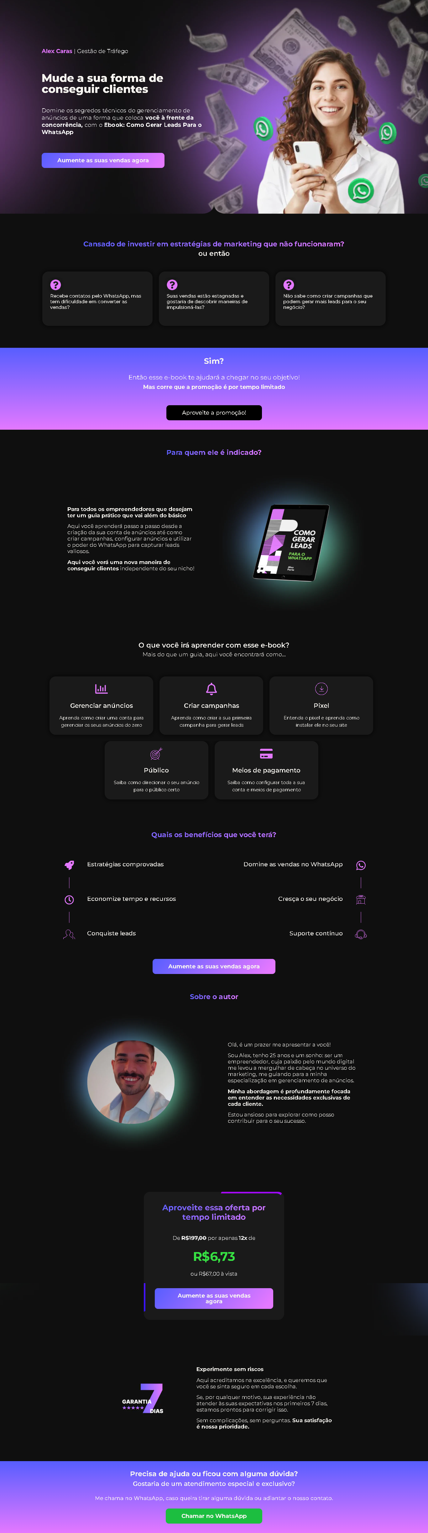 Desenvolvemos uma landing page estratégica para o eBook de Alex Caras, com foco em ensinar como gerar leads e captar clientes pelo WhatsApp. A página foi criada para ser altamente persuasiva e direta, com um design clean e chamativo.