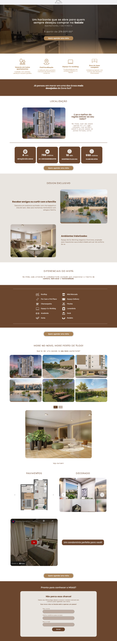 Para o Morada Ideal, desenvolvemos uma landing page totalmente voltada para apresentar o projeto do empreendimento de forma clara e envolvente. A escolha dos tons terrosos trouxe uma sensação de aconchego e proximidade com a natureza, alinhada ao conceito do empreendimento.