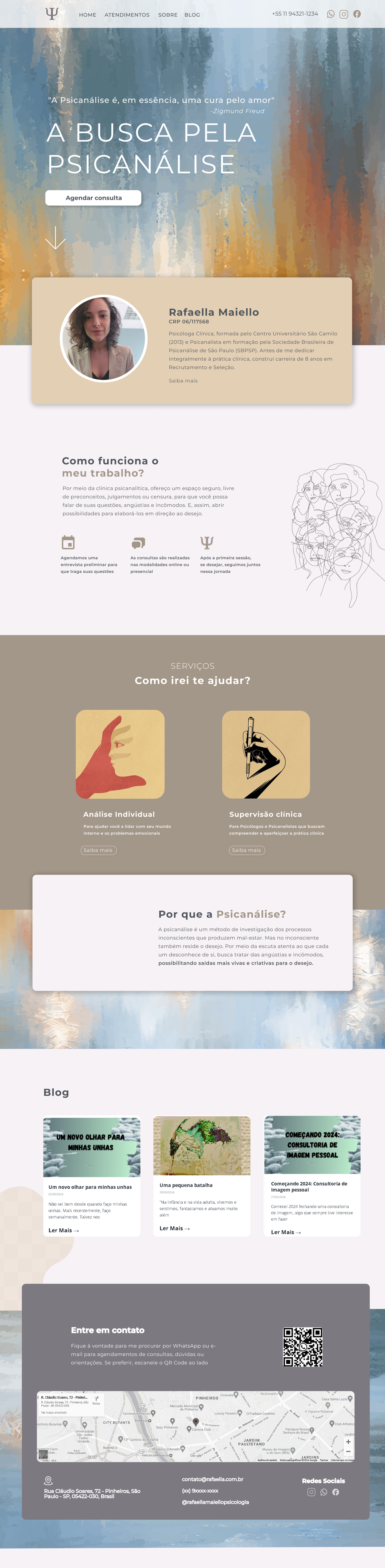 O projeto para a Psicóloga Rafaella Maiello foi especial, já que ela desejava um site que transmitisse sua essência, sem abrir mão de um visual moderno e funcional. Desde o início, a Rafaella nos trouxe diversas referências, e trabalhamos juntos para garantir que cada detalhe refletisse exatamente o que ela buscava.