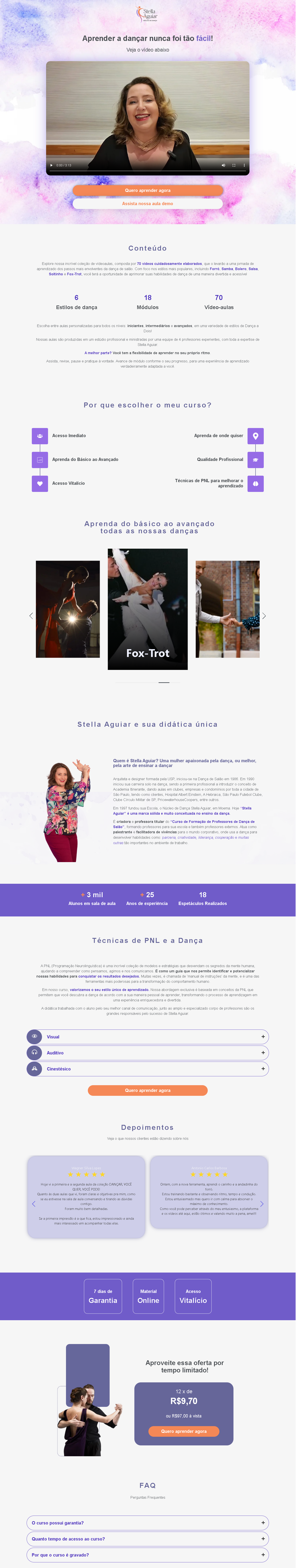 Criamos uma landing page personalizada para a professora de dança Stella Aguiar, com o objetivo de vender seu curso online. A página foi projetada para destacar os diferentes tipos de dança oferecidos, com foco na qualidade do ensino e na experiência do aluno.